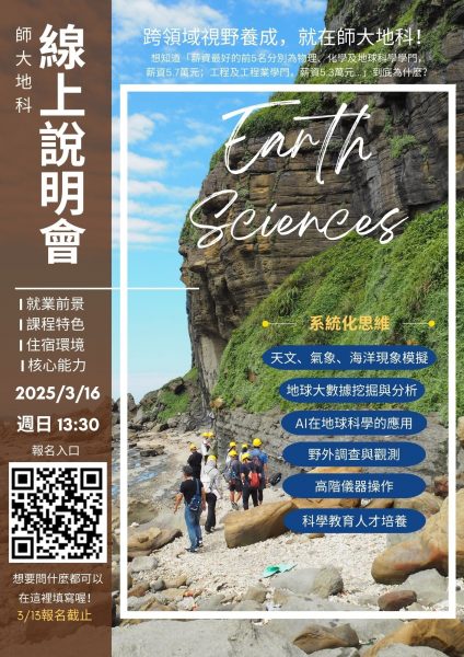 #地球科學系,到底在學什麼? 就業前景又為何? 這個系的課程特色、核心能力、以及學校的生活和住宿環境?想要一探究竟的,歡迎填報名表單、線上與您相會!