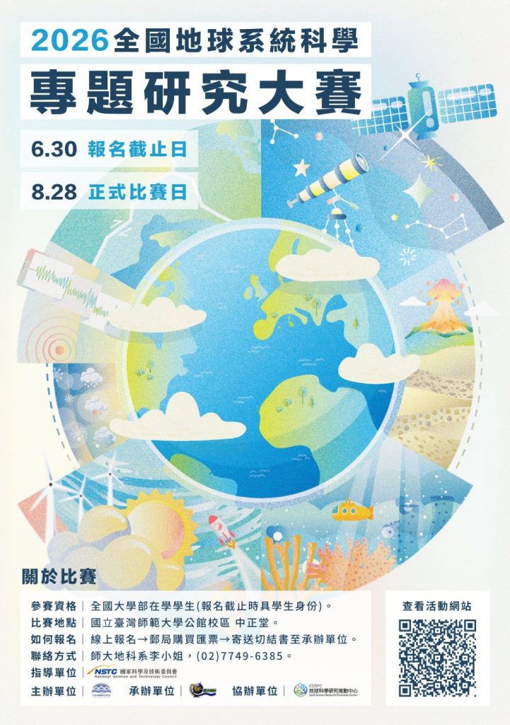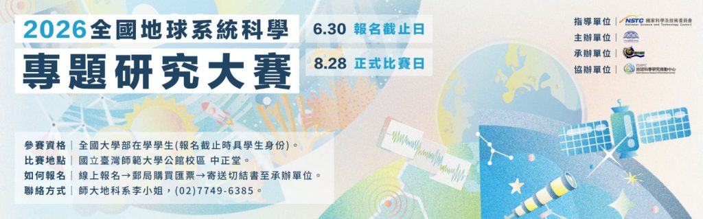 本專題研究大賽以培養學生科學素養與研究能力為核心目標,鼓勵國內大專校院學生及高中生 投入地球科學相關專題研究。透過研究歷程中之問題發現、研究設計、實驗分析、資料分析、模 型建構與成果表達等訓練,協助學生及早建立完整之科學探究能力,深化對自然現象與地球系 統之理解。此外,本競賽亦提供跨校、跨年級、跨領域之交流平台,以地球系統科學為核心,涵 蓋岩石圈、水圈、大氣圈、生物圈及天文等多元面向,促進不同背景學生之間的知識激盪與經驗 交流。藉由競賽與觀摩機制,激發學生對科學研究之熱忱,並培養其邏輯思辨、問題解決及學術 表達能力,對於未來地球科學人才之培育具有重要意義。